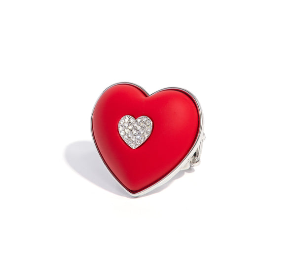 Dotted in dazzling white rhinestones, a smaller silver heart stands out as the centerpiece of an oversized red acrylic heart in a thin silver frame for a romantic pop of color. Features a stretchy band for a flexible fit.