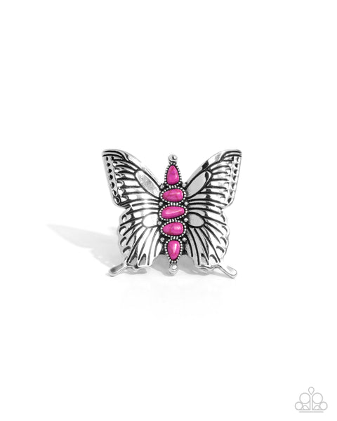 Set in textured silver frames, a collection of asymmetrical pink stones in various cuts is embellished along the body of an oversized, airy, textured silver butterfly for a naturally whimsical centerpiece. Features a stretchy band for a flexible fit. As the stone elements in this piece are natural, some color variation is normal.