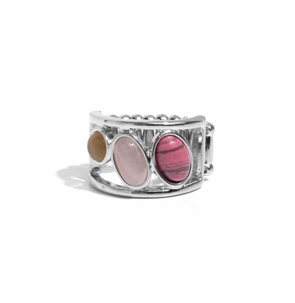Centered between airy silver bands, a tilted oval pink cat's eye stone, an oval pink-striped stone, and a round brown cat's eye stone slants across the finger, culminating into a colorfully coarse centerpiece. Features a stretchy band for a flexible fit. As the stone elements in this piece are natural, some color variation is normal.