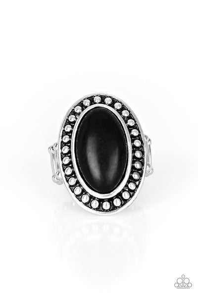 Chiseled into a smooth oval, an earthy black stone is pressed into a studded silver frame for a seasonal flair. Features a stretchy band for a flexible fit.
