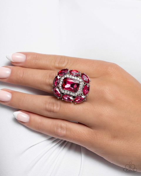 A faceted emerald-cut fuchsia gem is pressed into an elaborate silver frame filled with blinding marquise-cut gems in shades of fuchsia for a dynamically colorful statement atop the finger. An additional border of shimmer with dainty white rhinestones encircles the emerald-cut centermost gem for a light-reflective finish. Features a stretchy band for a flexible fit.