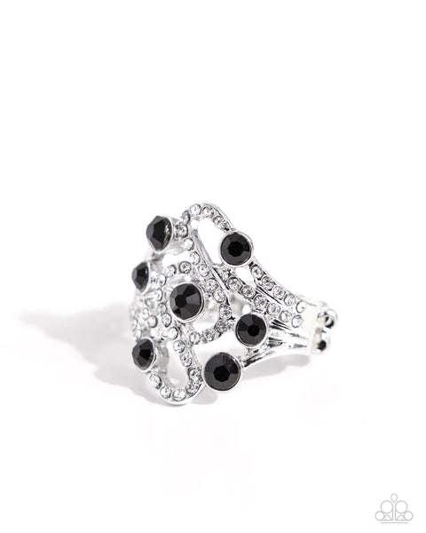 Sporadically infused with black gems, curls of white rhinestone-encrusted silver bars elongate atop the finger for a dazzling, high-class display. Features a stretchy band for a flexible fit.