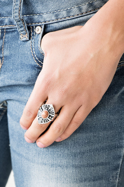 An earthy brown stone bead is pressed into the center of an angular silver frame radiating with studded and antiqued textures. Features a stretchy band for a flexible fit.