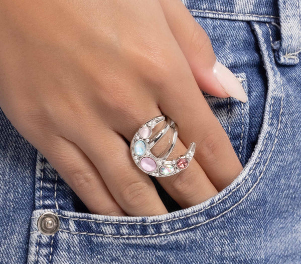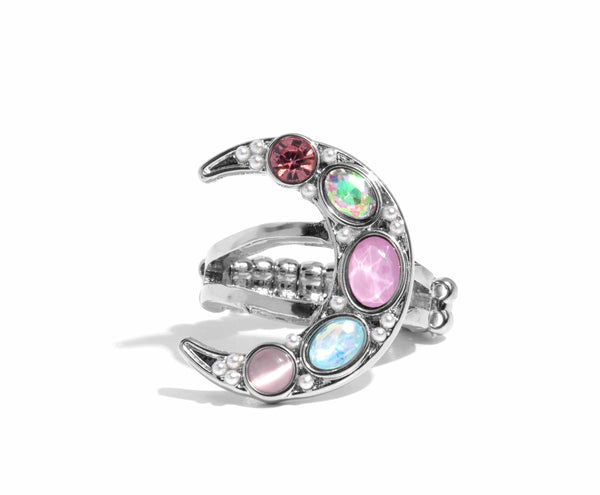 Featuring dainty pearl accents, a silver crescent moon is dotted with a rose gem, a UV-shimmery pink oval, a cloudy pink oval, an opalescent blue oval, and a round pink cat's eye stone for a unique luminescent centerpiece. Features a dainty stretchy band for a flexible fit.
