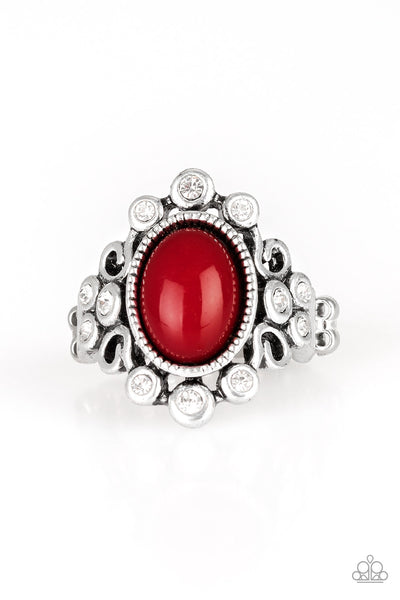 A polished red bead is pressed into a bubbly silver frame radiating with glassy white rhinestones for a notable finish. Features a stretchy band for a flexible fit.