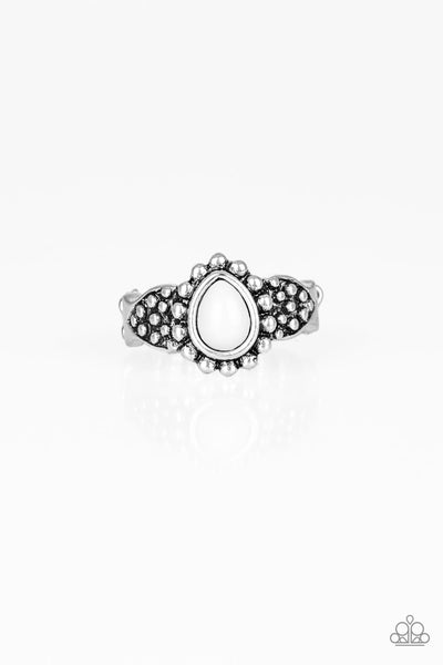 A teardrop gray bead is pressed into the center of a dainty silver band radiating with studded patterns for a seasonal look. Features a dainty stretchy band for a flexible fit.