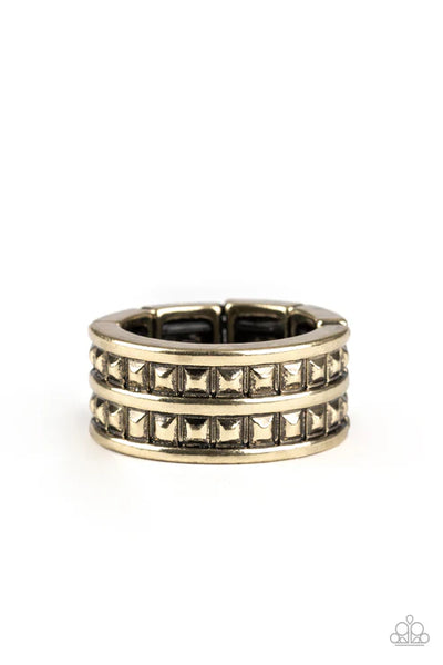 Brushed in an antiqued finish, two rows of faceted square studs stack across a brass band for a rustic look. Features a stretchy band for a flexible fit.