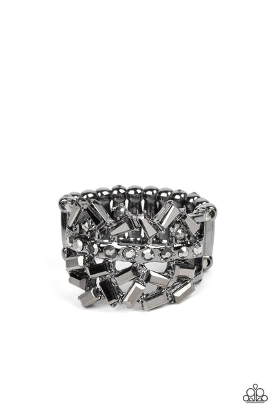 Dotted in dainty hematite rhinestones, a single gunmetal band separates a haphazard explosion of round and emerald cut hematite rhinestones across the finger. Features a stretchy band for a flexible fit.