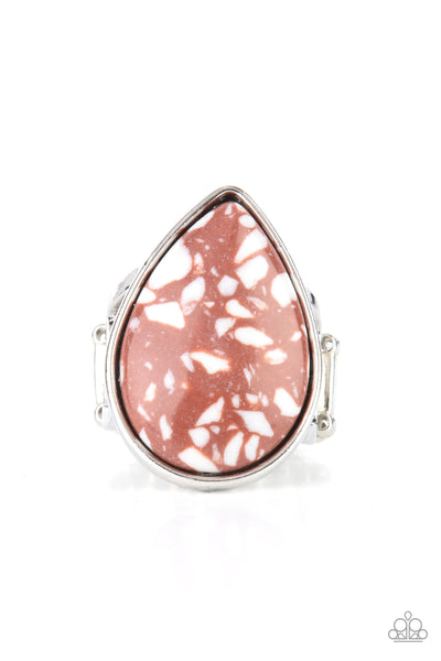 A generous polished Adobe stone infused with white flecks is encased in a simple silver teardrop frame resulting in a seasonal finish atop the finger. Features a stretchy band for a flexible fit.