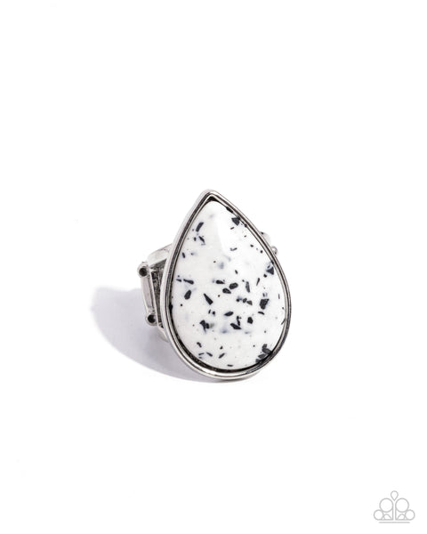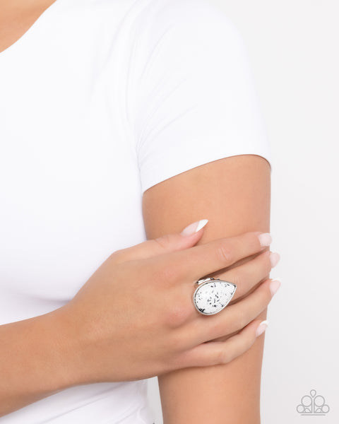 A generous polished white stone infused with black flecks is encased in a simple silver teardrop frame resulting in a seasonal finish atop the finger. Features a stretchy band for a flexible fit.