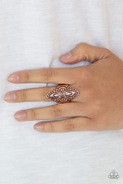 Stamped in floral patterns, a shimmery copper frame folds around the finger for a seasonal flair. Features a stretchy band for a flexible fit.