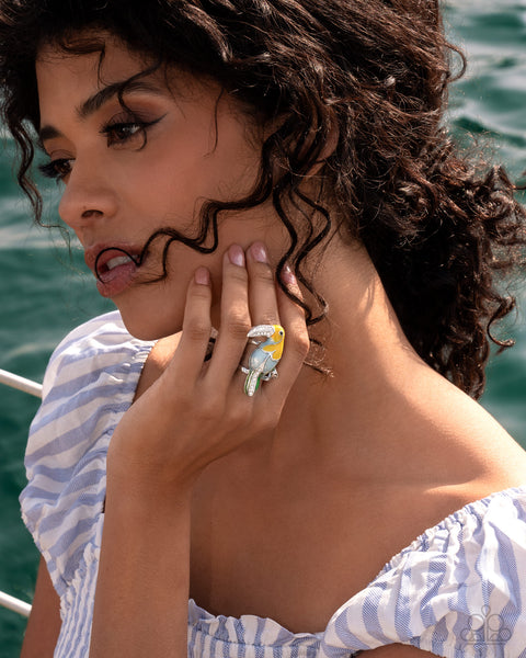 Featuring White Grape, Misted Marigold, and Limpet Shell spots of paint, a toucan bird with a black rhinestone eye, white rhinestone beak, and white rhinestone-detailing perches atop airy silver bands atop the finger for a blingy statement. Features a stretchy band for a flexible fit.