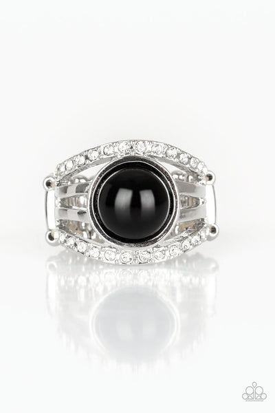 Radiating with glassy white rhinestones, row after row of glittering silver bars arc across the finger. A shiny black bead is pressed into the center of the layered bands, adding a dramatically refined finish to the piece. Features a stretchy band for a flexible fit.