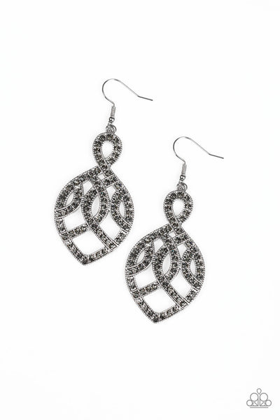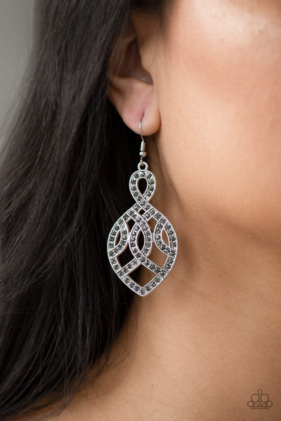 Encrusted in smoky rhinestones, ribbons of shimmery silver loop into an ornate frame for a refined flair. Earring attaches to a standard fishhook fitting.