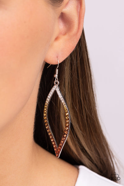 A glistening asymmetrical silver leaf-like frame is encrusted in glassy white rhinestones that gradually fade from brass to copper, creating a colorful ombre effect for a statement-making look. Earring attaches to a standard fishhook fitting.