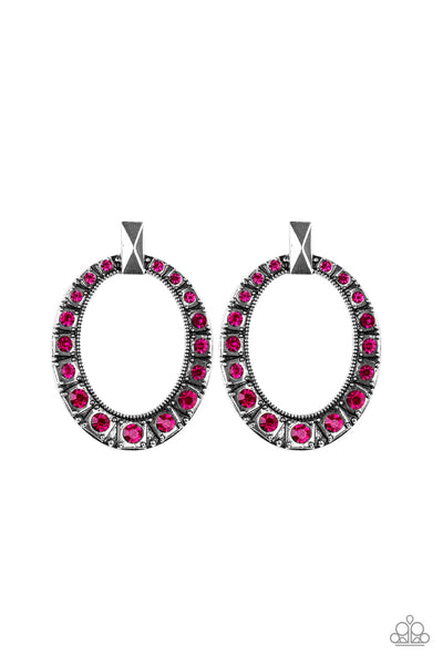 Featuring a faceted silver fitting, a beveled silver hoop is encrusted in glittery pink rhinestones that gradually increase near the bottom of the ornate frame for an edgy finish. Earring attaches to a standard post fitting.