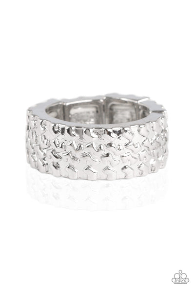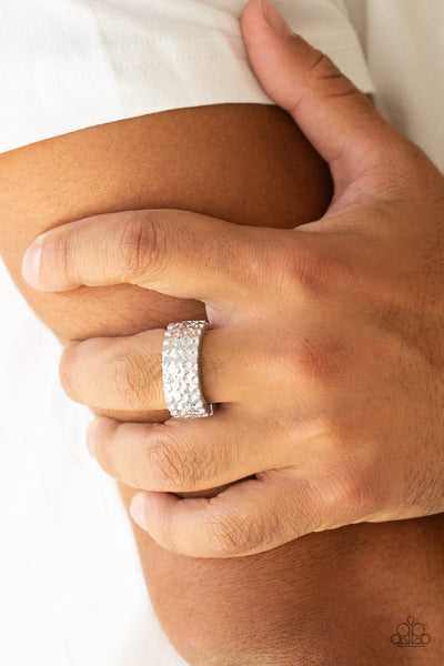 Embossed in a tactile tread-like pattern, a glistening silver band curls around the finger for an edgy look. Features a stretchy band for a flexible fit.