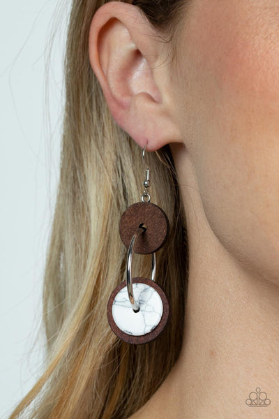 An earthy collection of brown wood and white stone discs are threaded along a silver hoop, linking into a trendy lure for an artisan inspired fashion. Earring attaches to a standard fishhook fitting.