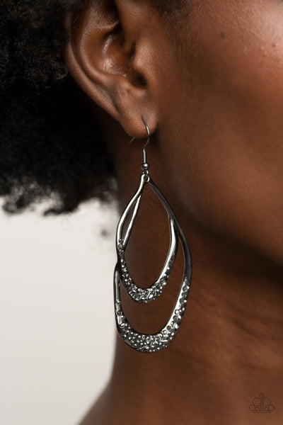 Dainty hematite rhinestones are encrusted along the bottom of warped gunmetal teardrop frames that overlap into a glittery lure. Earring attaches to a standard fishhook fitting.