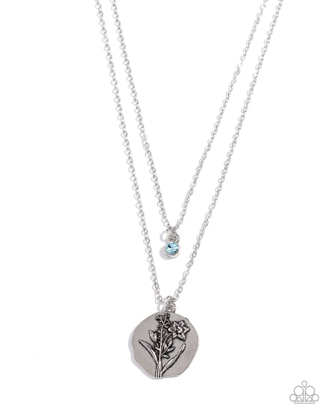Two shimmery silver chains layer down the chest. Featuring an aquamarine rhinestone in a silver frame, the uppermost strand gives way to a classic silver pendant featuring an embossed daffodil flower, flawlessly displaying the sentimental symbols that celebrate those born in March. Features an adjustable clasp closure.