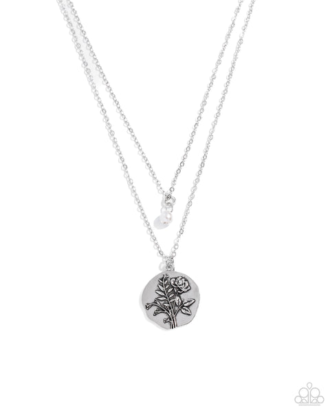 Two shimmery silver chains layer down the chest. Featuring a glossy pearl, the uppermost strand gives way to a classic silver pendant featuring an embossed rose flower, flawlessly displaying the sentimental symbols that celebrate those born in June. Features an adjustable clasp closure.