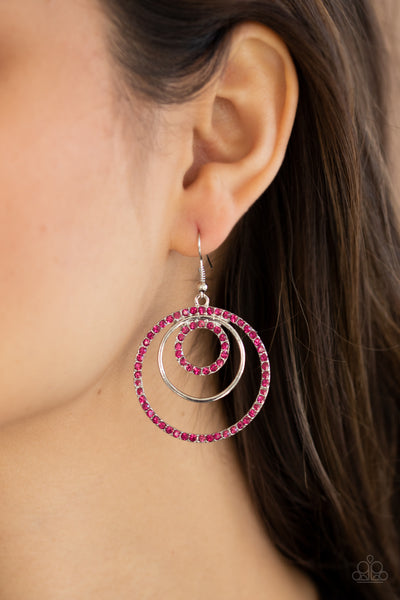 Plain silver and pink rhinestone encrusted silver rings ripple out into a bubbly hoop, creating a dizzying display. Earring attaches to a standard fishhook fitting.