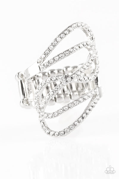 Encrusted in glittery white rhinestones, sparkling silver ribbons swoop across the finger for a refined look. Features a stretchy band for a flexible fit.