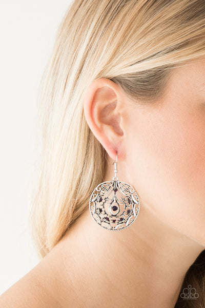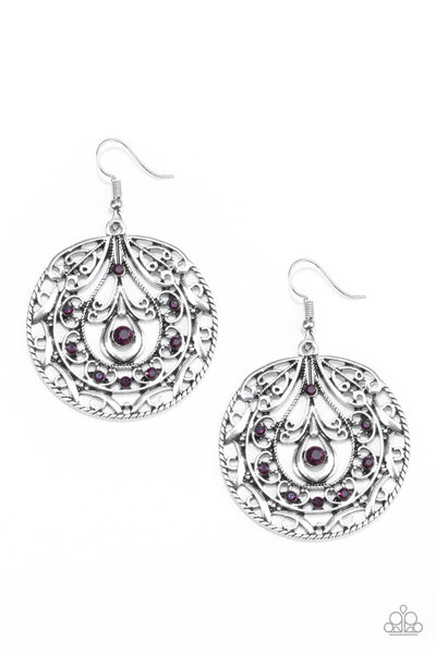 Sparkling purple rhinestones are sprinkled along a swirling silver backdrop radiating with whimsical filigree. Earring attaches to a standard fishhook fitting.