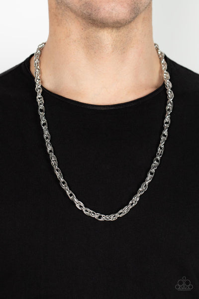 Glistening silver links ornately interlock across the chest, resulting in an edgy industrial centerpiece. Features an adjustable clasp closure.