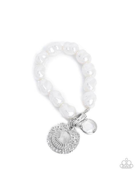 A series of lustrous baroque white pearls thread around the wrist, creating a timeless and elegant look. An ocean-inspired silver charm and a glassy clear disc, dangles from the bracelet for added movement and whimsy. Perfect for a seaside or sophisticated ensemble, this bracelet effortlessly combines classic and coastal aesthetics.