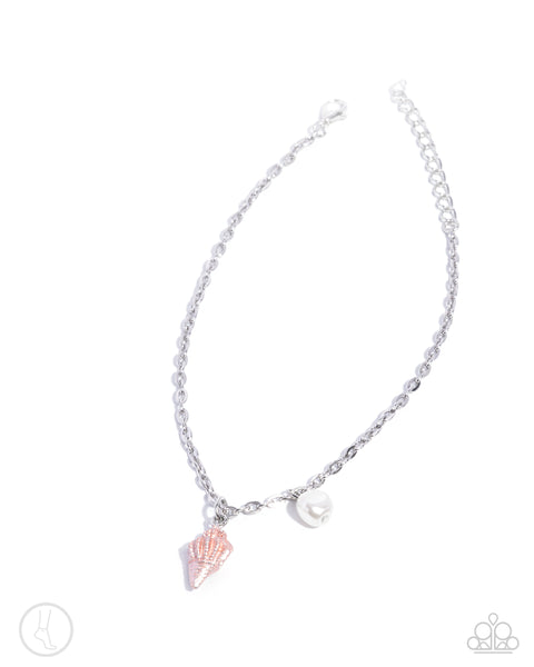 Featuring reflective orange paint, a conch shell charm, and baroque white pearl dance along a dainty silver cable chain along the ankle for a coastally chic look. Features an adjustable clasp closure.