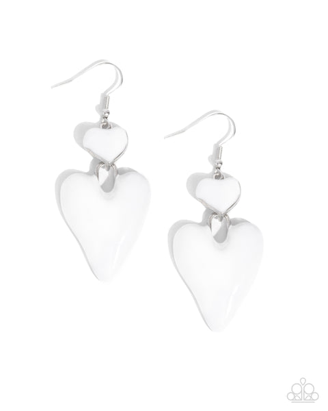Featuring shiny white paint, a dainty heart frame delicately links with a larger heart frame for a colorfully caring look. Earring attaches to a standard fishhook fitting.