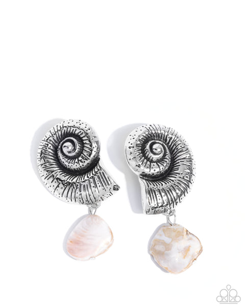 Swirling silver shells cascade into glistening faux shell drops, creating a coastal-inspired statement, adding a touch of oceanic elegance to any ensemble. Earring attaches to a standard post fitting.