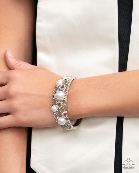 A collection of white rhinestone-embellished silver rings, airy silver rings of varying sizes, and white pearls set in silver circular fittings in varying sizes, are scattered around the front of the wrist on a silver band, for an overly opulent display of shimmer and color. Features a hinged closure.