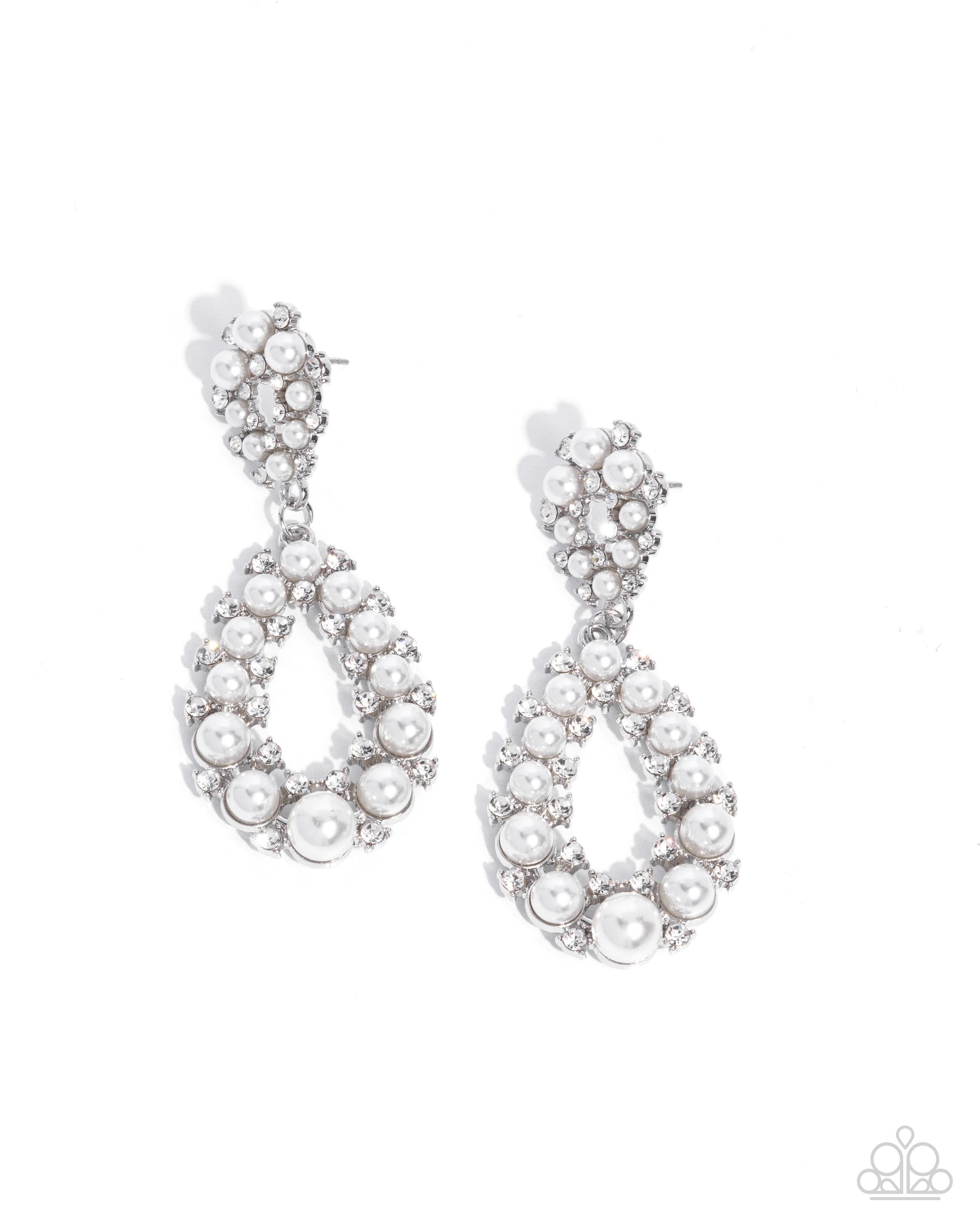 Varying in size and shape, a refined collection of silver-pronged white rhinestones flare out and are encrusted along a row of white pearls that gradually increase in size along an upside-down silver teardrop frame, giving way to a larger right-side-up teardrop frame embellished in the same timeless details for an attention-grabbing look. Earring attaches to a standard post fitting.