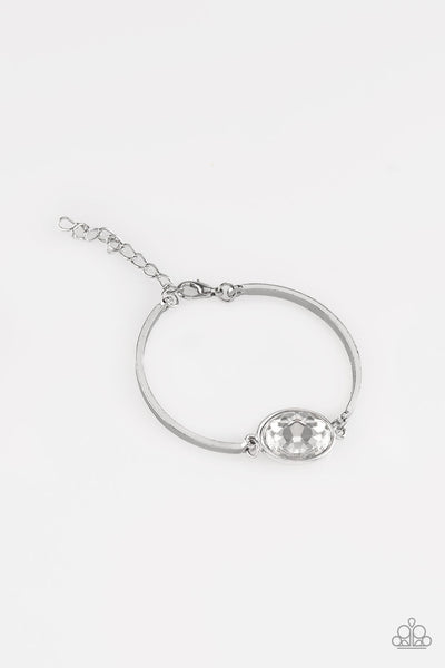 Arcing silver bars connect to a faceted white gem centerpiece, creating a dainty cuff-like bracelet around the wrist. Features an adjustable clasp closure.