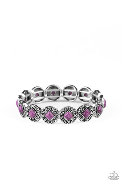 Featuring square purple stone centers, ornate silver frames are threaded along a stretchy band around the wrist for a seasonal flair.