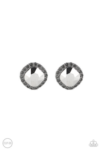 A border of smoky rhinestones spin around a dazzling hematite rhinestone, creating a glamorous frame. Earring attaches to a standard clip-on fitting.