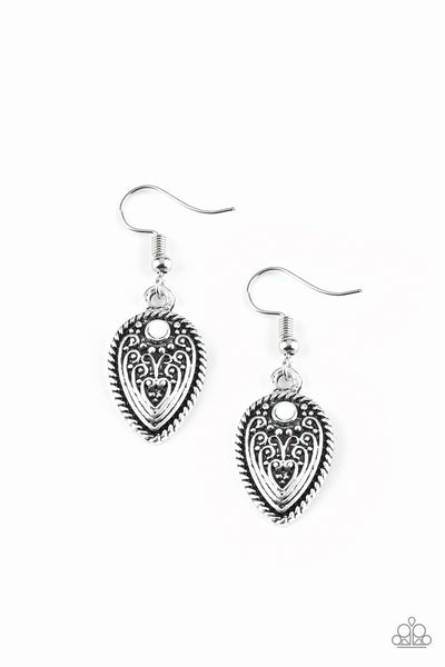 Embossed in whimsical antiqued textures, a shimmery silver teardrop frame swings from the ear. A dainty white bead is pressed into the top of the frame for a colorful finish. Earring attaches to a standard fishhook fitting.