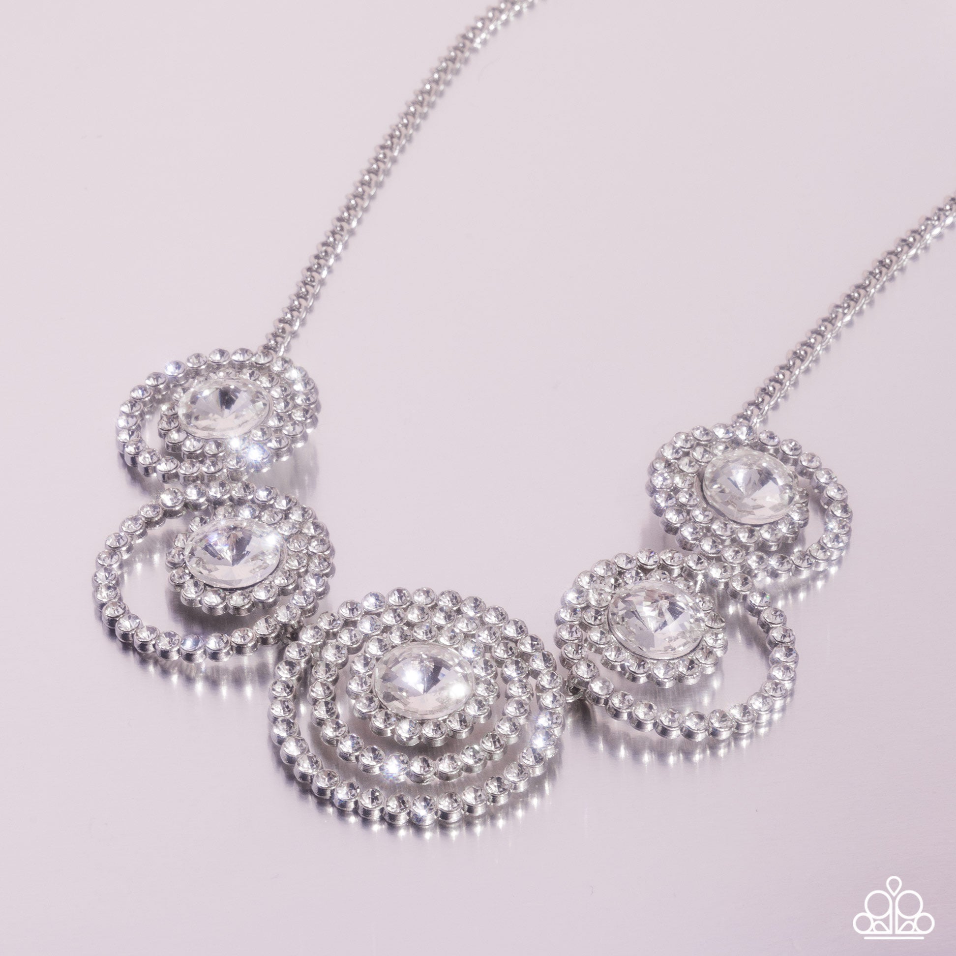Encrusted in glassy white rhinestones, layered silver frames delicately connect below the collar for a statement-making finish. Featured in the center of the effervescent rings, faceted white gems come to a point for a dramatic touch of color along the neckline. Features an adjustable clasp closure.