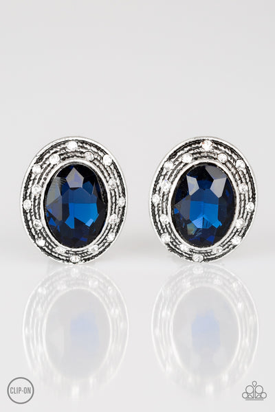 Sporadically dotted in white rhinestones, a textured silver frame spins around a faceted blue gem center for a refined look. Earring attaches to a standard clip-on fitting.
