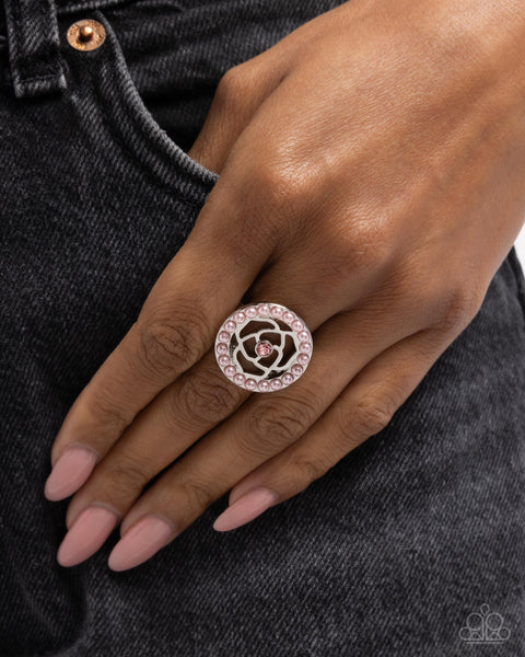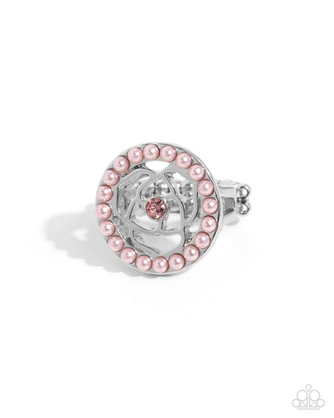 Bordered by baby pink pearls, an airy, embedded silver rosette with a light rose rhinestone center stands out atop dainty silver bands for a whimsical pop of color. Features a dainty stretchy band for a flexible fit.