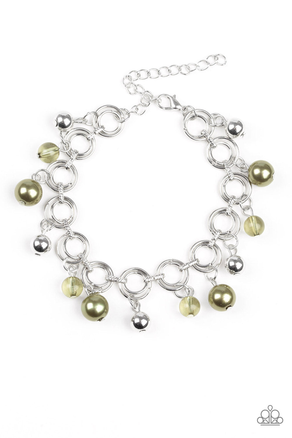 Featuring pearly and glassy finishes, an array of silver and green beads swing from a double-linked silver chain, creating a fancy fringe around the wrist. Features an adjustable clasp closure.