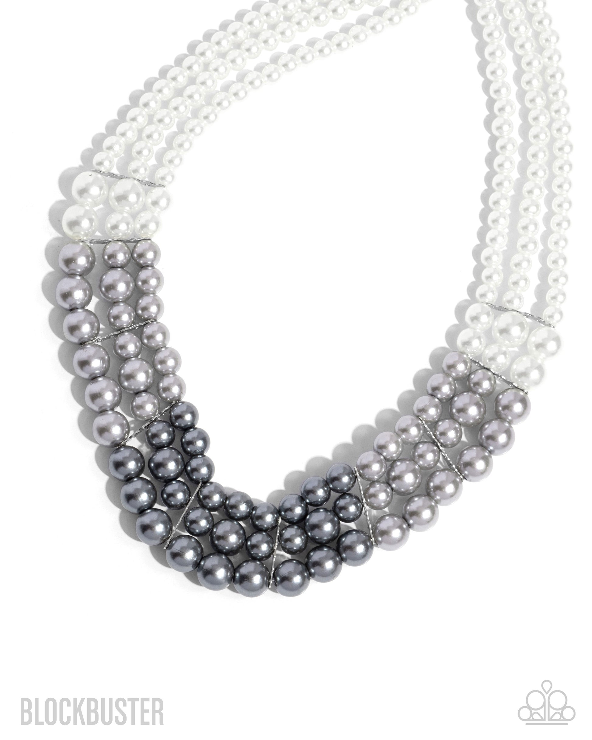 Strands of white, silver, and dark gray pearls elegantly drape below the collar, creating a beautiful ombre effect. Sectioned by silver accents, the luminescent pearls radiantly fall into a glamorous cascade. Features an adjustable clasp closure.