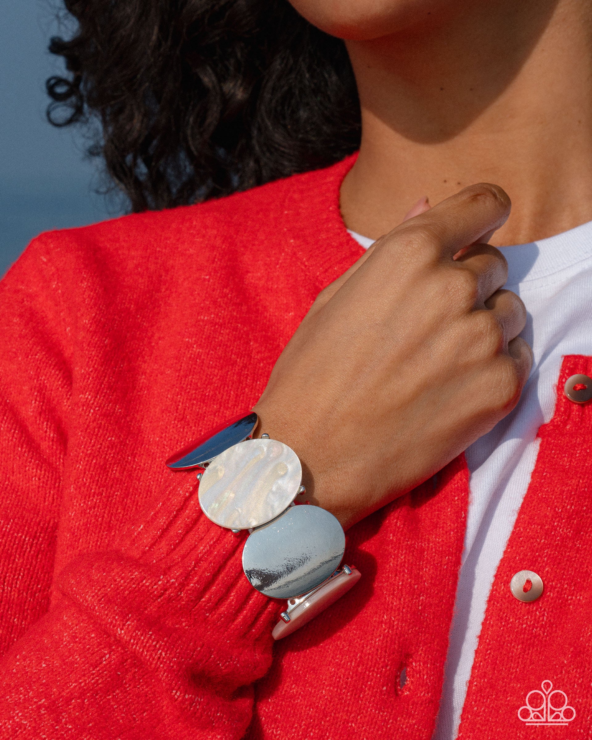 Infused along elastic stretchy bands, a collection of shimmery white acrylic ovals and silver oval frames pattern around the wrist for a whimsical pop of color.