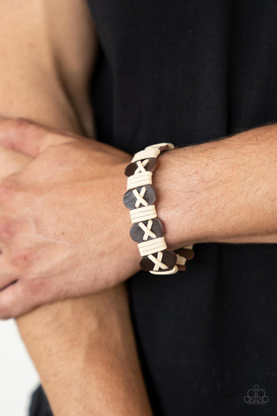 White suede cording is threaded in a crisscross pattern along the front of a wavy brown suede band. Additional white cording wraps across the scalloped band in intervals creating a rustic handmade look. Features an adjustable snap closure.