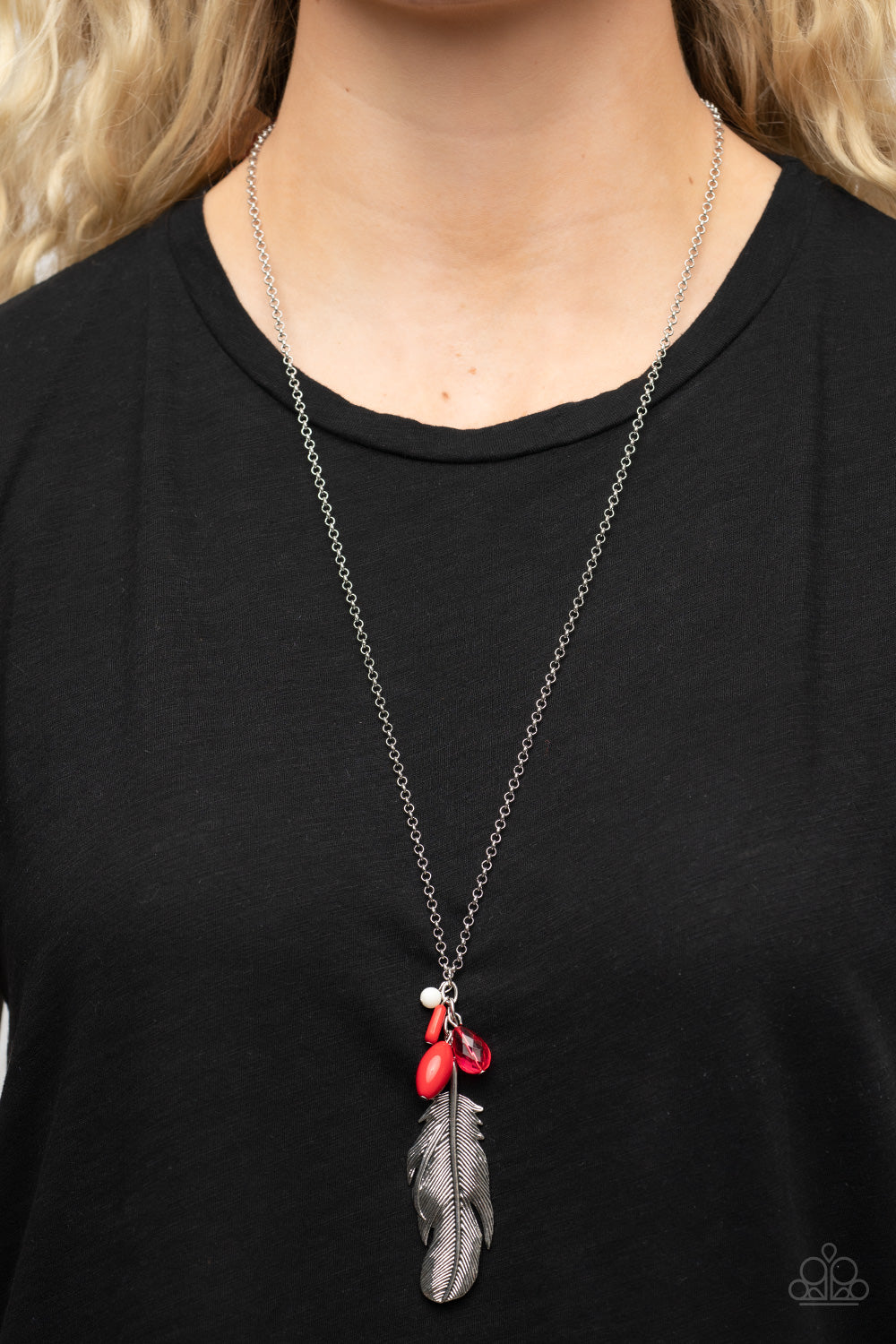 Infused with glassy and acrylic red and white beads, an oversized silver feather swings from the bottom of an extended silver chain for a fearlessly free-spirited fashion. Features an adjustable clasp closure.