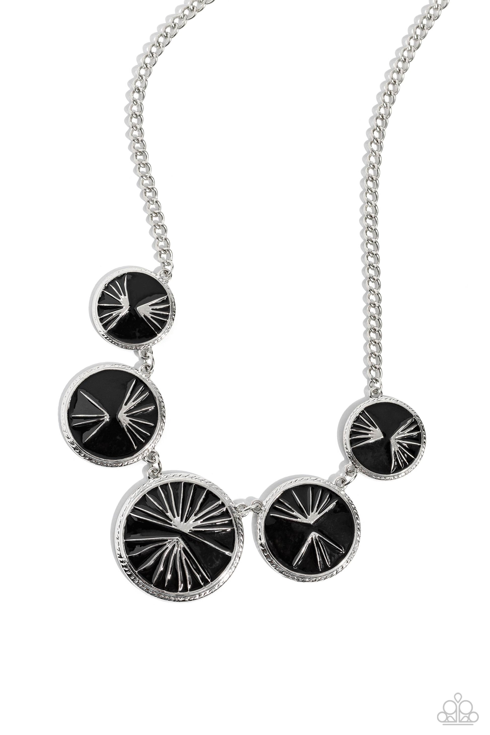 Embossed in shimmery silver palm leaf patterns, round black frames link below the collar for a summer-inspired look. Each black-painted frame is encircled in silver rope-like texture for an industrial finish. Features an adjustable clasp closure.