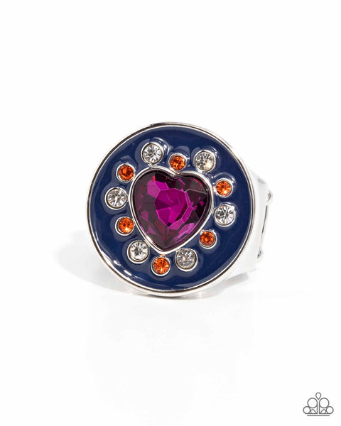 Featuring a navy-painted backdrop, a fuchsia heart gem glistens atop a silver disc, surrounded by white and orange rhinestones that alternate for a romantic pop of color atop the finger. Features a stretchy band for a flexible fit.