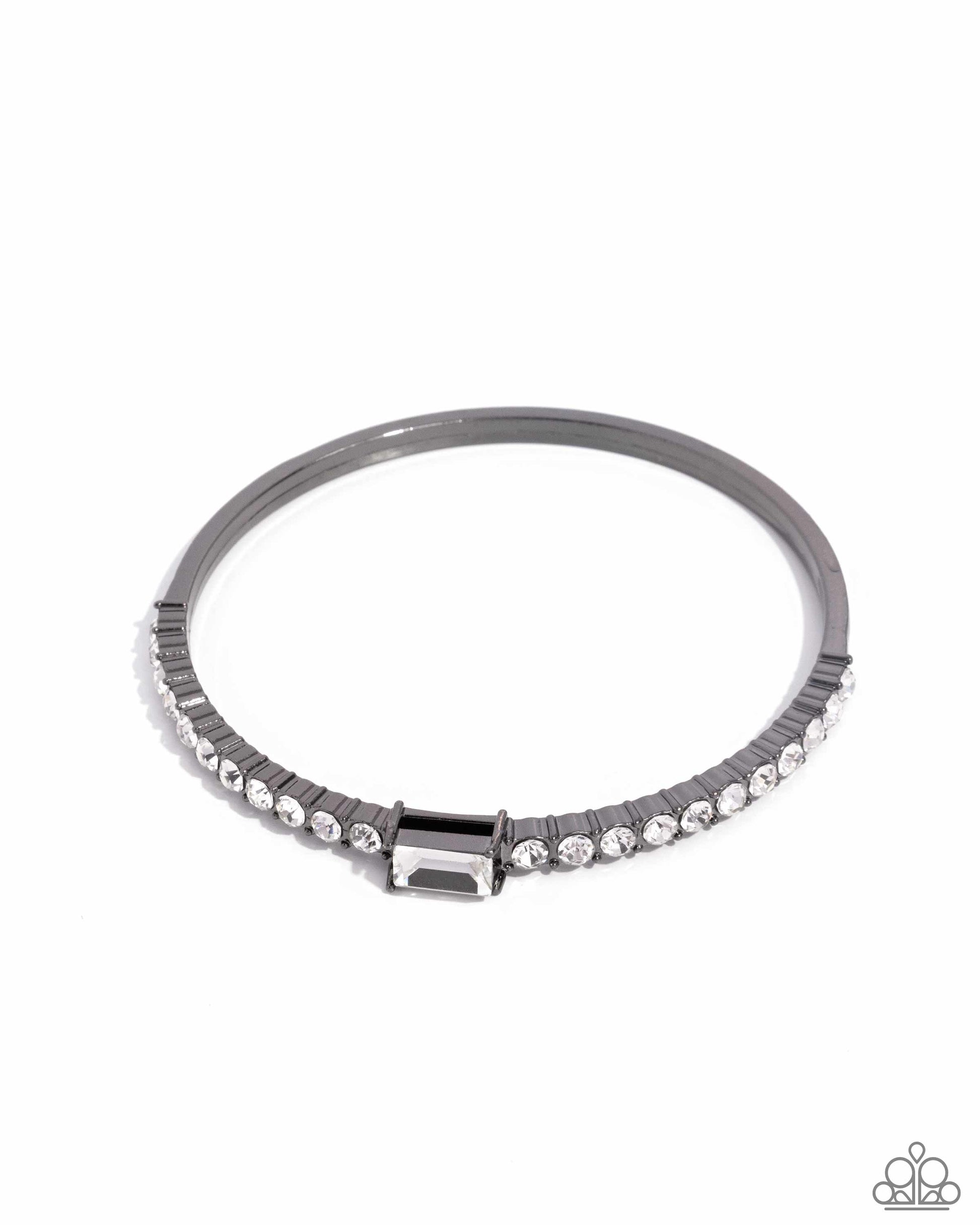 An emerald cut white rhinestone sparkles between a row of glassy white rhinestones across the front of a stunning gunmetal bangle, resulting in a stackable and sparkly centerpiece.